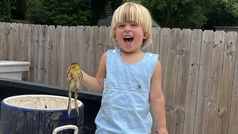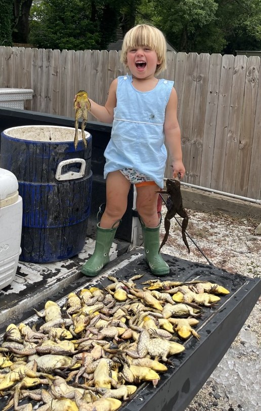 Guy McAleer III showing off a pile of big bull frogs caught at his dad’s camp in Venice (Pass a Loutre) on July 1, 2022. These allowed the family to keep their July 4th fried frog leg tradition alive.