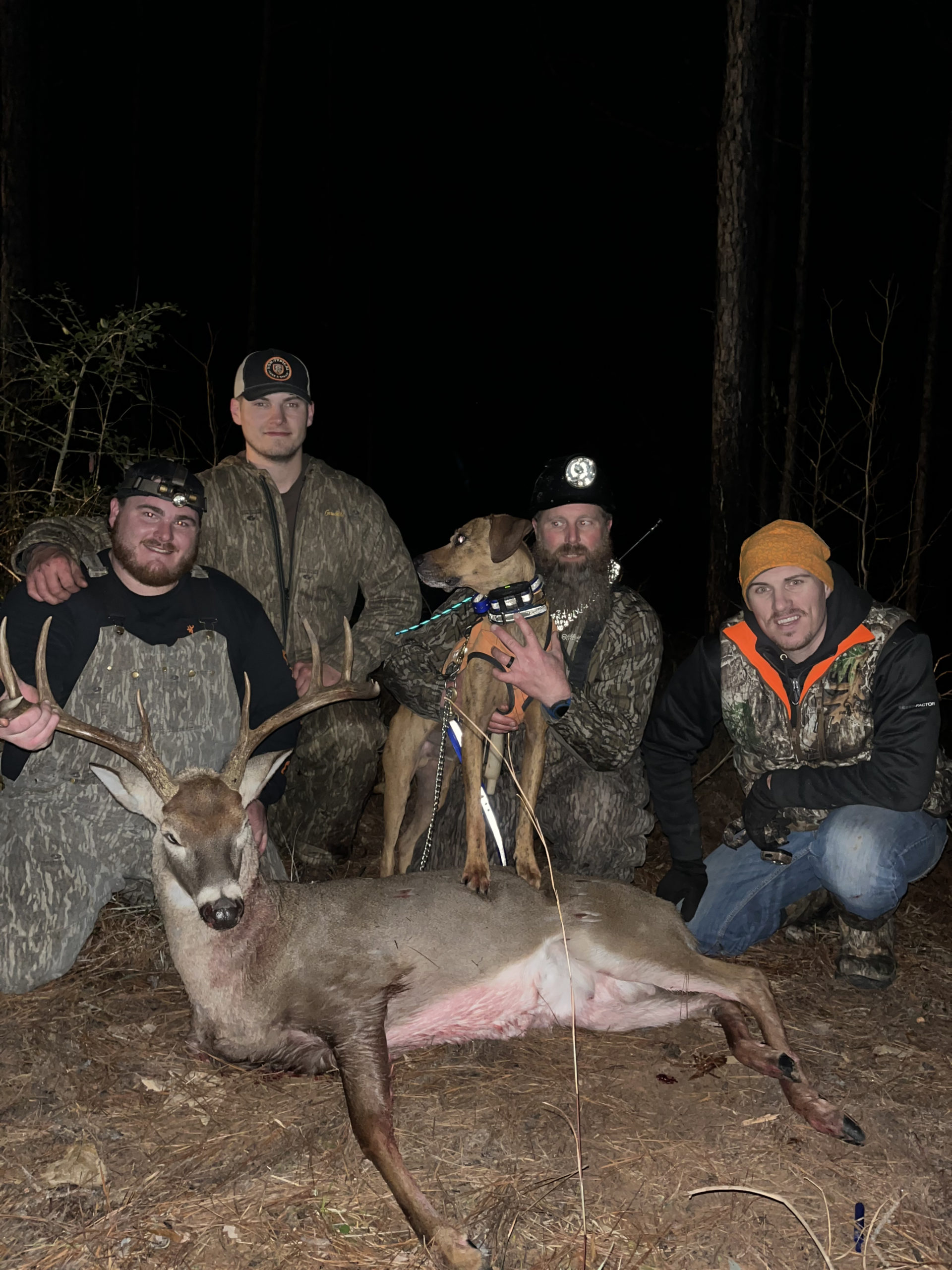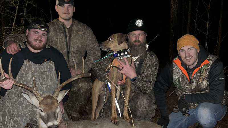 “The deer was shot in Grant Parish in a block of Kisatchie National Forest north of Dry Prong. I took out to the woods Saturday afternoon 12/24, knowing this frigid air had to have the deer on their deer. Me and my buddy, Joey Turner, who had hunted up this way for a few years always told me they had good deer in the area and invited me on many hunts hoping to lock down a wide 8-point and a big 10-point he had game trail pics of. Well we’d been after them for about 1.5 months. I took out to the woods around 1 p.m. and finally got settled in my tree where Joey had hunted the previous day and had a good feeling about the area. A few hours past, no sign of a deer until about 4:45. I seen a nice buck out the corner of my eye trotting through the bottom, and I shoulder my rifle trying to find him in the scope and hopefully get a shot but it was to late. I was hoping my luck would turn around and about 5:20 evening, as the light was getting dim in the woods, I seen the silhouette of a nice deer hop across the creek I was hunting by. I gathered myself, shouldered my 35 Whelen, and found him in the scope. When he picked his head up I had the crosshair’s exactly where they needed to be and shot. I knew I had crushed him as he fell hard and ran off tucking his front leg. I climbed down and called two buddies that lived nearby to help me pack him out. I went to look for blood, to my surprise there wasn’t any at the shot sight, but I didn’t get discouraged as I knew Gator was a phone call away and I knew the deer was hit hard. I called Scott and Brandy. They loaded up Gator and headed my way. When we walked Gator in, he was standing up on his back legs. This isn’t my first rodeo with Gator and seeing him work. I knew he was smelling the deer with the wind coming in our face. We arrived the shot site and turned him loose. He ran back towards the truck. The opposite way of which I saw the buck run and I heard Scott’s Garmin sound off a few times, I knew what that meant. We had a big buck down. We ran just across the creek to find a steady blood trail leading straight to the deer. As Scott approaches the deer I hear him say “it’s a little 4-point,” knowing there was no way that’s what I shot, but of course he’s got jokes. lol. I was very happy to have been able to connect with such a nice buck on public land and glad to have been able to share the memories with some great friends.”