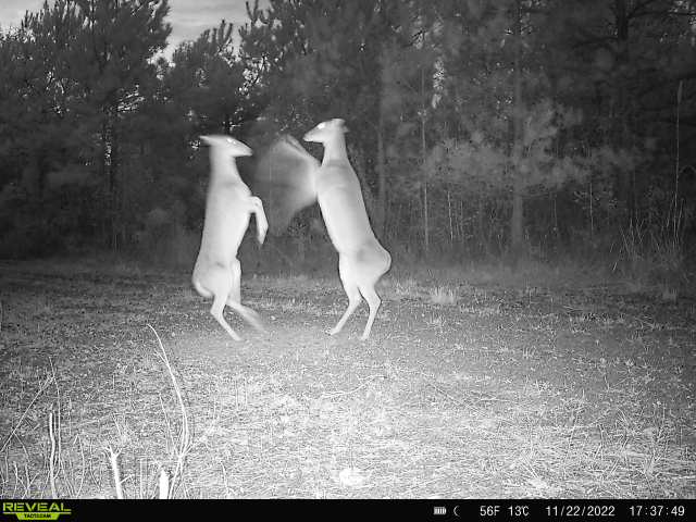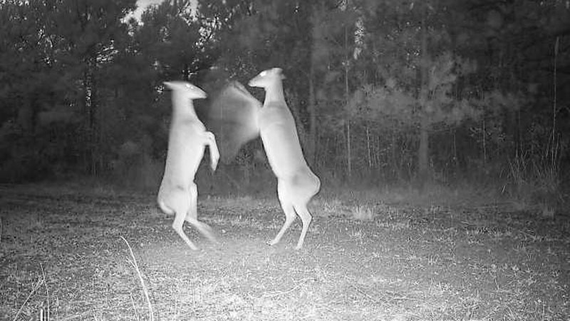 Rachel Darbonne Smith caught an amazing shot on her game camera north of Eunice, La., of two deer standing on their hind legs swinging their front hooves at each other as if boxing. The camera flash made the two deer look like ghosts. Their eyes and the shape of their heads is quite spooky.