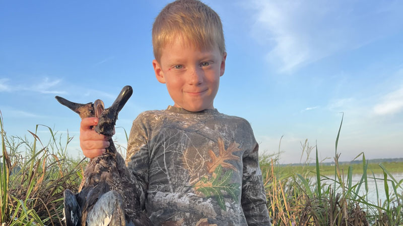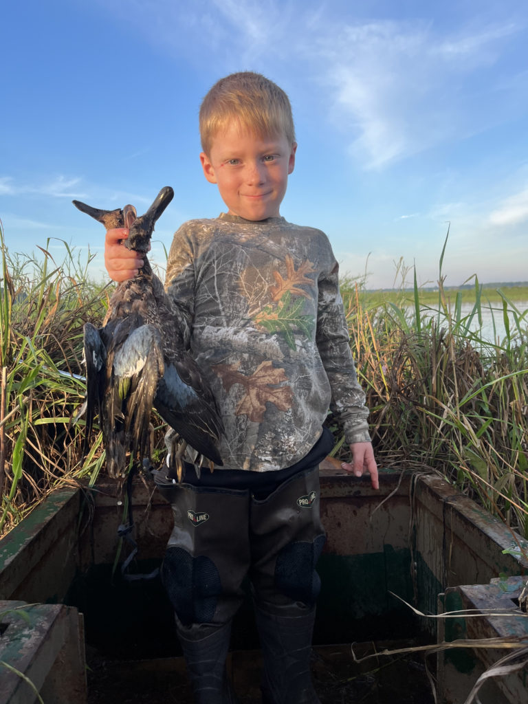 Hayes Firestone, 5, of Iowa, La., with his very first pair of hip boots. Hayes hunted alongside of his dad, Camrin Firestone, Papaw, Keith Guillory, great uncle, David Guillory, and a few of his cousins. They limited out each morning and Hayes enjoyed using those hip boots to go help Lily, the family’s black lab, retrieve the ducks!