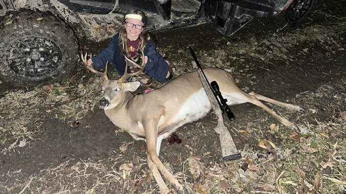 Jenna Greene, 8, practiced shooting for months and finally got an opportunity at a deer after weeks of hunting hard. She dropped a huge 8-point for her first deer at 180 yards in Lottie, La., using a youth stock that her dad had to cut even shorter due to her size. She couldn’t be happier or more excited that she did this on her own.