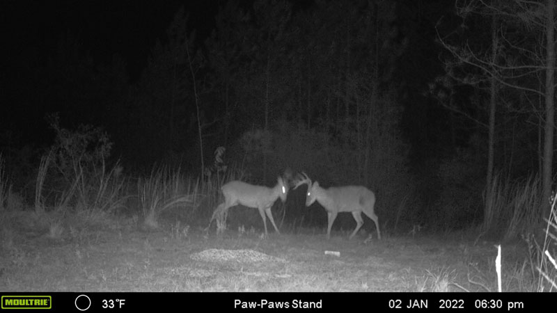 Jeremy Jones of DeRidder caught these two late season bucks fighting. This is one of three separate occasions of different bucks within the last month. The location is South Vernon Parish/Beauregard Parish line on property adjacent to the Sabine River. Jeremy has been getting a lot of late season quality bucks on his camera.