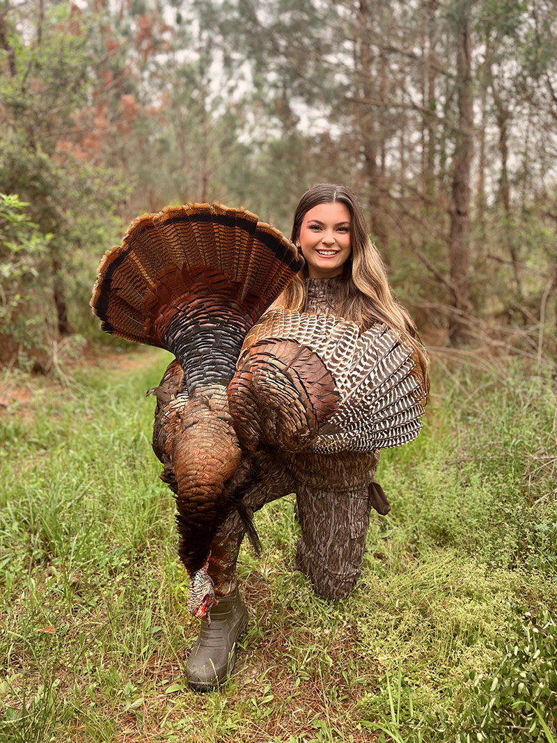 Shelby Fontenot landed her first gobbler on April 7, 2024 at 7:30 a.m. in St. Helena Parish. The morning started off cloudy and quiet but quickly became the hunt she was wishing for when her boyfriend of 5 years, Wyatt Thomas, called the turkey in from a creek bottom. He had a 8 3/4-inch beard.