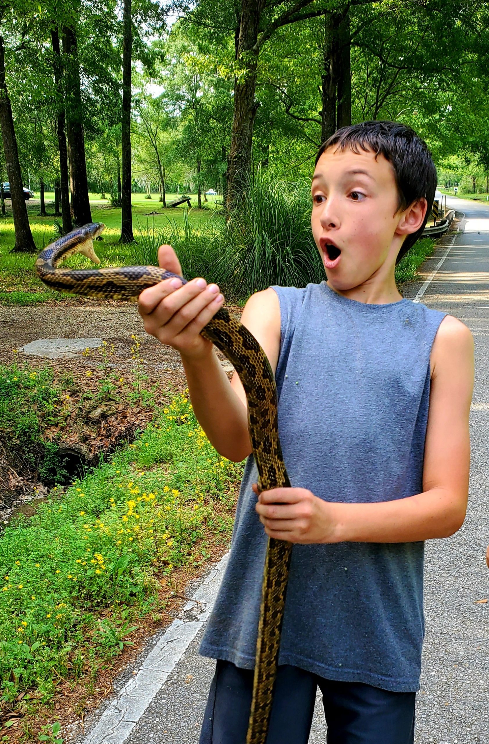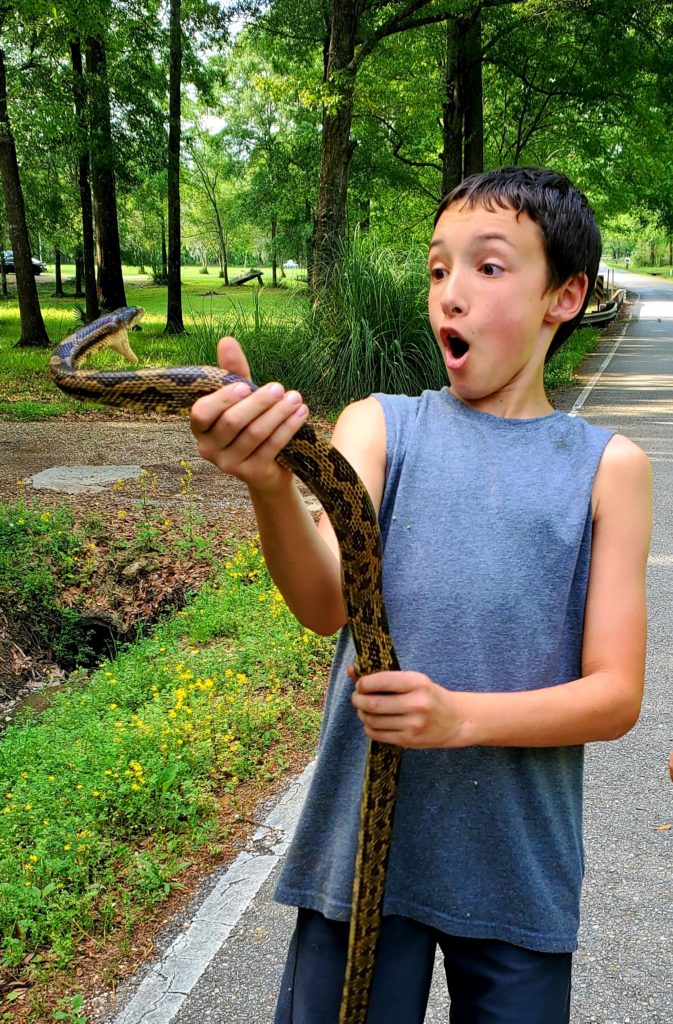 Luke Michel found this “friendly” Rat snake on a walk around his home in Prairieville, LA earlier this year. You can see by the way they both have their mouth open they were both surprised. He always enjoys catching any other non-venomous snakes that he sees.