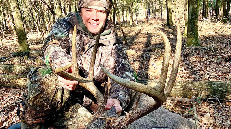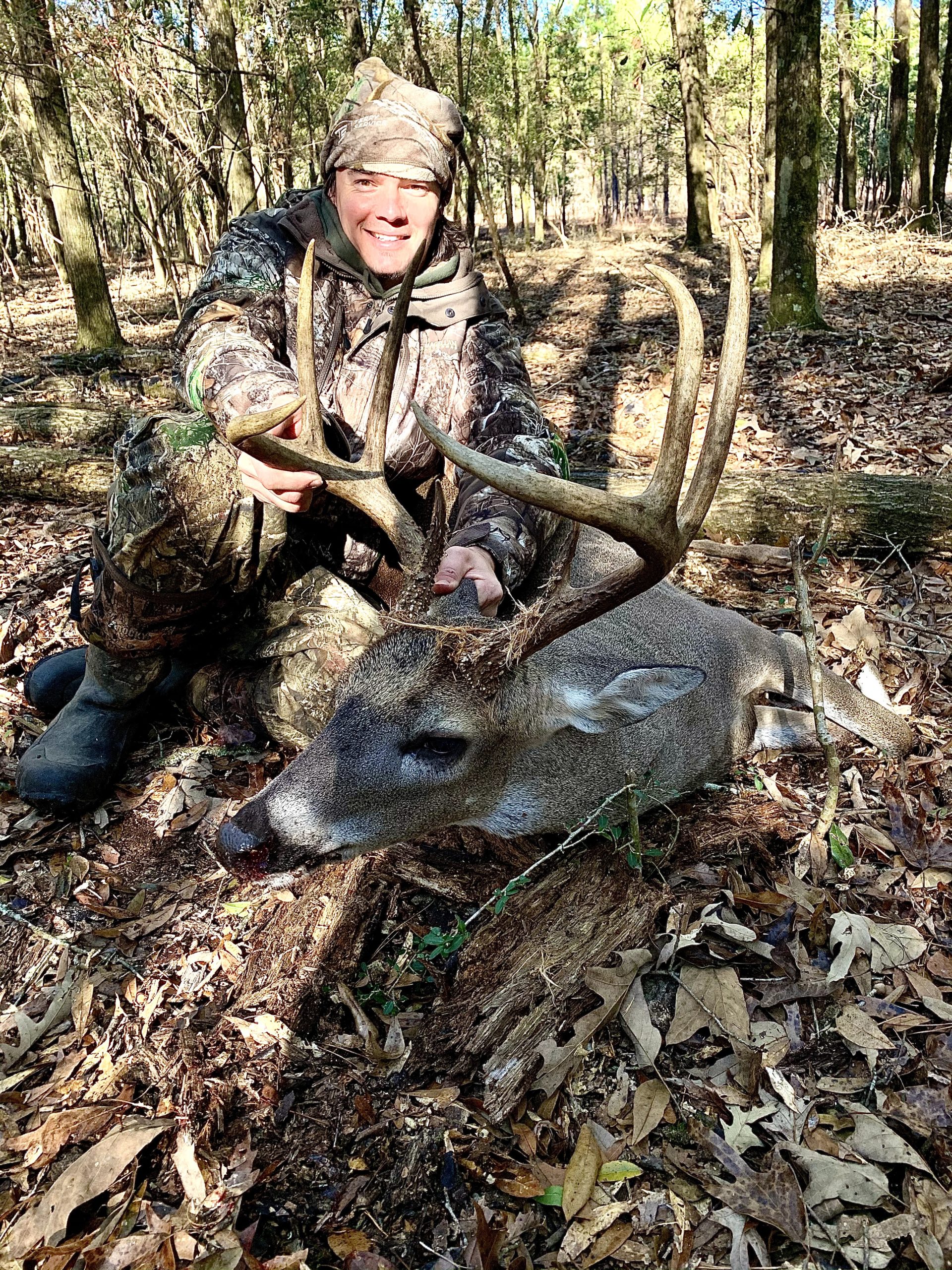 “Two days after Christmas, Dec. 27, will be a day I won’t soon forget. That weekend was one for the books to say the least. The day before was the first time my buddy, Dee, ever hunted the family land I am able to hunt in Mississippi. We saw 64 deer that day and I was able to take a nice 7-point that evening. The morning of the 27th was the day we were going to get Dee his deer. I told him we were going to sit in a new stand I deemed the buck parade the year before. This was due to the fact that I had seven different bucks chasing does around me one morning last year. I told my friend it seemed like I was sitting on the sidelines watching a buck parade, that’s when the stand got its name. We were running a little behind that morning and it was cracking daylight when we were getting into the stand. As we were slipping in downwind of the stand, something caught my eye. I saw what I thought was a decent buck about 100 yards in front of the stand. I looked at Dee and said “there’s your buck brother.” I told him to stay on my hip pocket as we eased our way closer to get a better look at the buck that was pushing a doe. I was laser focused on the animal as I snuck through the woods. After walking about 50 yards, I turned to tell Dee that it was definitely a shooter because I was able to catch a glimpse of what looked like tall tines on one side of his rack. Unbeknownst to me, Dee had stopped walking about 40 yards back and waved for me to keep going. I walked another 20 yards and saw the doe he was pushing coming into the opening. I rested my gun on a small sweet gum tree and shouldered my Browning 7mm-08. The buck seemed to have a sixth sense about him and just wouldn’t come into the opening. As he turned to walk away from me, I noticed the large rack that rested upon his head. He took two more steps to the left and eased into a small opening. I had a gap in between two small saplings and I could see his vitals. I let out a deep breath, steadied the rifle, and squeezed the trigger, BOOM! I did not see the deer after I shot so I slowly walked back to Dee and told him to go back to the west and go sit in another oak bottom while I went to look for blood. He said “no way man, I’m coming with you. I know you hit the deer, I heard it hit.” So we went back to where I was standing when I shot the deer and looked down into the saplings. The deer had fallen in his tracks. We both saw the deer at the same time and let out some yells of excitement as we jumped up and down like a bunch of school girls. Man were we pumped. As we approached the deer, I then understood that this was by far the biggest buck I, or anyone else had ever taken off of the family property. As I reached down to pick up his rack, I was in disbelief. I ran 12-15 trail cameras on the property all throughout the year, I even had one about 50 yards from where I was holding the deer and never once had a picture of him. That’s why I named him the Unknown 8. After taking about 47 pics and getting that “perfect angle” we began to butcher the deer and pack him out. We got back to the truck after a long walk out of the woods packing the deer out and I began calling friends and family. It is a moment I will never forget. The deer ended up scoring 140 3/8 inches, which is an absolute giant for Wayne County Mississippi. I got the deer mounted by Walkers Wildlife Art Studio and hung it next to the big screen in my man cave. Several times a week I still stop and admire him for several minutes before walking down the stairs.”