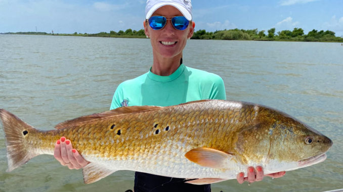 With limited fuel now, I realized we couldn’t make it back to Hackberry from Cameron. Thank God for shrimp boats and generous deck hands. With my temporary tank full again, I headed to Oyster Bayou for a much-needed siesta in calm waters. Heather continued to fish intensely while I dozed off on the front cushion of my 24-foot SeaPro, ahh, so peaceful, then, I was startled by the panicked sound of her voice. “It’s taking it. It’s taking it! I nearly cut a flip jumping up only to see a frantic and wide-eyed Heather about to be pulled over the side of the boat by what I immediately recognize as a big bull redfish! Perfect, and the battle is on! LOL, what a sight, under the boat, behind the motor, then to the front of the boat and under the anchor rope, then back under the boat and to the side. That fish gave her everything he had — awesome! Twenty minutes later, victory! She landed the biggest fish she had ever seen and was so excited and proud. Wow.