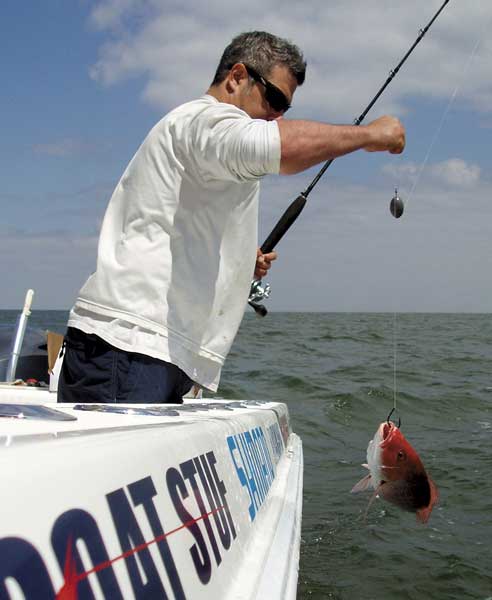 Instead of the usual heavy sinker and Carolina rig, we opted for single Mustad 6/0 weighted hooks with cut pogies. The only problem with this set up was that the snapper inhaled the offering — hook and all — which made releasing them difficult.