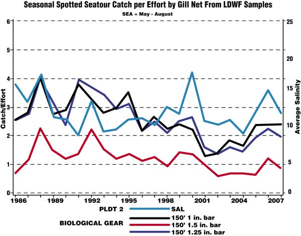 “The trout that recreational anglers harvest in Louisiana are spawning fish,” said LDWF Coastal Finfish Manager Harry Blanchet, “especially during the summer when the bulk of the fishing occurs, and, as such, they are going to be limited to areas that have conditions conducive to spawning — relatively high salinities approaching 20 parts per thousand.”