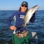 The big trout weren’t biting at this first location where I was surf fishing next to my anchored kayak. A horrible line of lightning storms from the west started moving through, and without a clue of how long it might last, I decided to paddle back to safety instead of hunkering down on a marsh island.