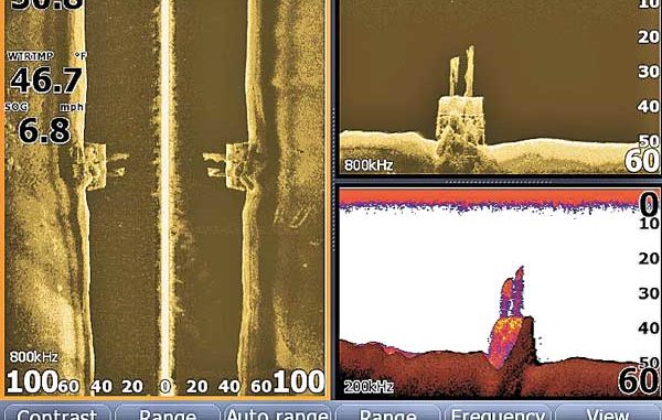 That capability is scheduled to be included in Humminbird’s next free software update, and it will be called Down Imaging. When you pass directly over an object, SI splits it in two and shows half of it in the right side view and half in the left view. Humminbird engineers developed software that recombines the two halves into a single vertical view. The new update should be available by the time you read this.