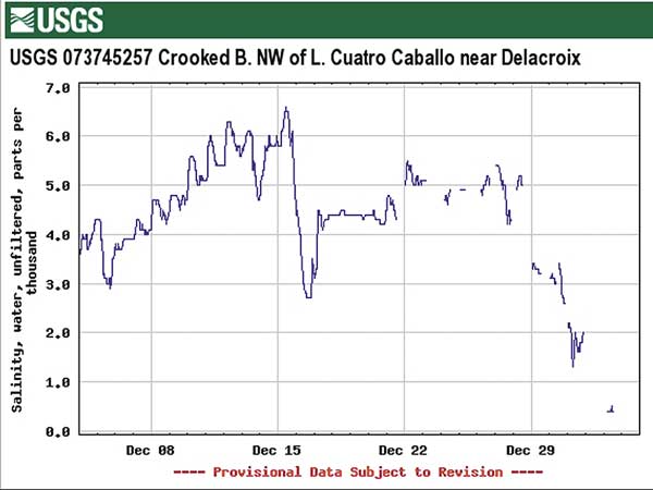 “The USGS has a monitoring station at Crooked Bayou, near Four Horse Lake and another in Bay Gardene,” Cuquet said. “By going to the web site, I can see the salinity, gauge height and water temperature. Low salinity will really shut the fish down. By checking this site, I can tell what effects the (diversion) is having and where I will need to fish.”