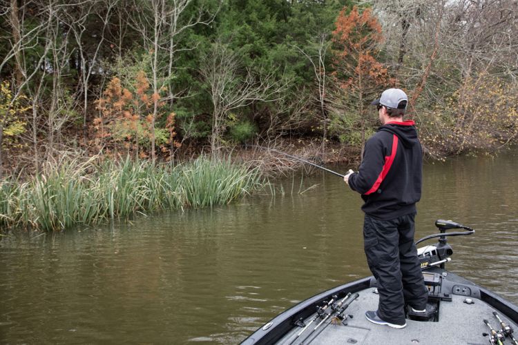 After giving up on the crankbait, Wiley picked up a jig. He ran to another patch of reeds on the other side of the lake and started pitching it a foot back into the vegetation.