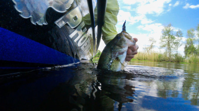 “All I could say was — ‘don’t come off, don’t come off,” he said. He finessed the fish through the set of lilies and then was able to boat-flip him. Basey started his day with a five pound bass and was able to catch several more between two and four pounds that day.
