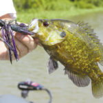 “Punching is a finesse technique using the ultimate power rig,” McCorkel explained as he sank his heavy jig through lilies and grass on the edge of a short bend along the bank. “You’re taking a ¾-ounce or 1-ounce or even 1 1/2-ounce weight with a heavy wire hook — trying to be as stealthy as possible, slipping it through heavy grass, water lilies and what not. The bass will get underneath those lilies any time there’s extremely hot weather, where they’ll use it for shade. During the winter, it’s also successful, when fish use these locations for warmth as well.”