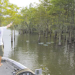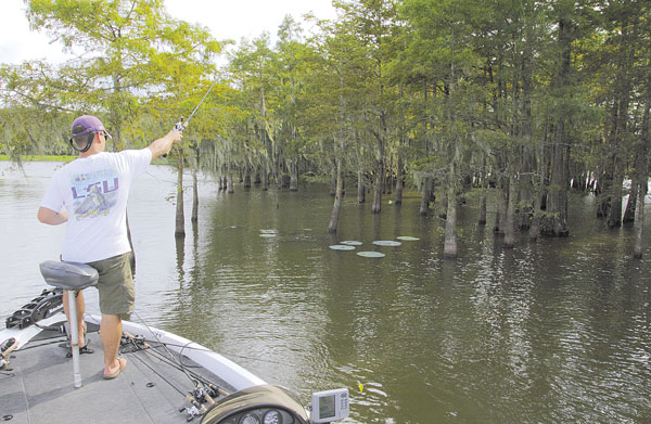 “I’m always trying to find places in the Basin with little points and breaks where fish will stage and set up. When the water is higher, they’ll be pushed up into the swamps, where access is going to be limited. When water is falling, it pulls the bait out — fish chase the bait. Generally speaking, they’ll be more on the outside edges of cover, and a little more accessible.”