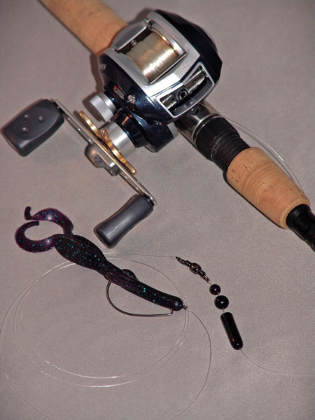 In its simplest definition, the Carolina rig puts a leader with an unweighted plastic bait on one side of a swivel and the main line with a weight on the other. When retrieved across the bottom, the weight bumps its way over, through and across whatever it finds, while the bait rides high in the water column.