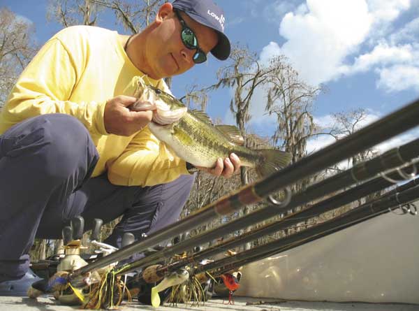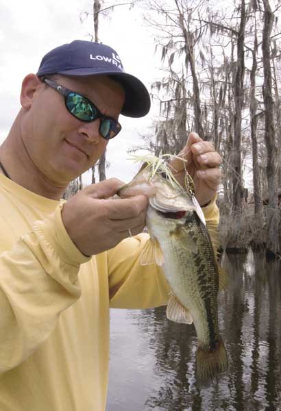 “I tied those on because I was expecting stained water,” he explained. “The problem is that those colors are overpowering in clear water, where bass feed more by sight than by any of their other senses. We’ve got to tie on more natural-looking colors like shad or crawfish patterns.”