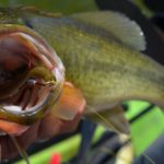 He began the day with two rods rigged with baits I hadn’t seen before. One was a watermelon seed Senko-type worm called a Trick Worm, rigged wacky style. The other was a watermelon red Tiny Toad frog, fished weightless.