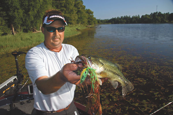 Once the grass takes full form — either nearing the surface or matting over — the fish pack their bags and move into the botanical labyrinth. With shade and oxygen production creating a cool, comfy environment with ample ambush opportunity, bass revel in their summer digs. Here, your down baits are most effective.