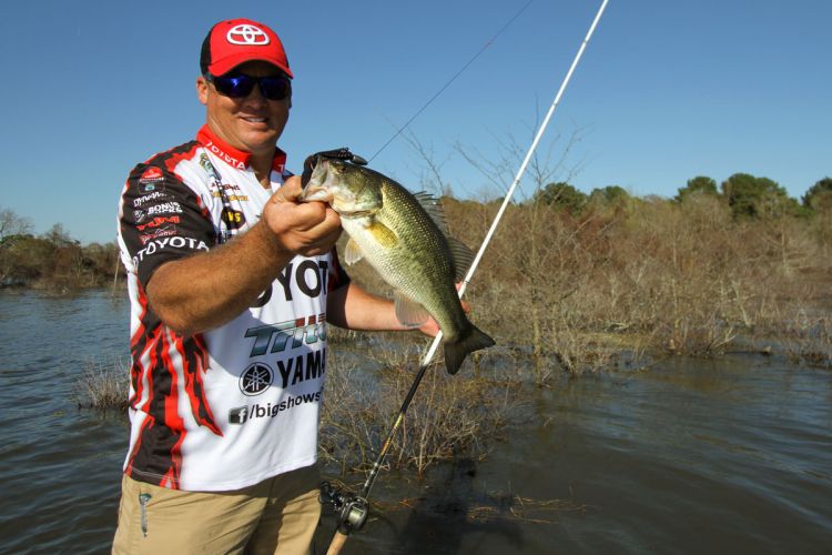 A big fan of flipping/pitching to shallow cover, Bassmaster Elite pro Russ Lane offers this suggestion: “I look for laydowns with small holes because this gives the fish the cover they want, but it allows me to get a bait in there to them. I also want that laydown to be close to a drop-off, because big fish want to have access to deep water.”