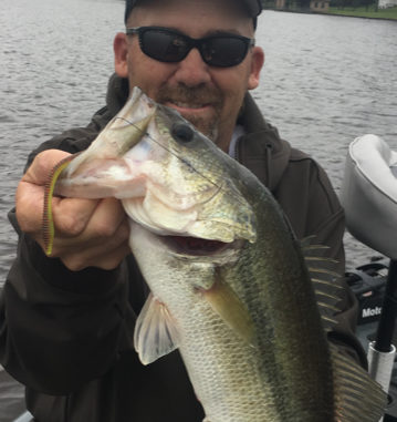 Mike Cork of Benton holds a good-sized bass that bit on a Tri-Alive 6.5 Nightcrawler made by Minden-based Mister Twister.
