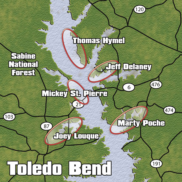 Also a founding member of Tri Parish Fishing Club, Thomas Hymel is another bass angler from Paulina who makes the annual pilgrimage to Toledo Bend. He pointed to the 1215 area as one of his favorite, and he believes this spot best replicates the kind of fishing that South Louisiana anglers would find comfortable.