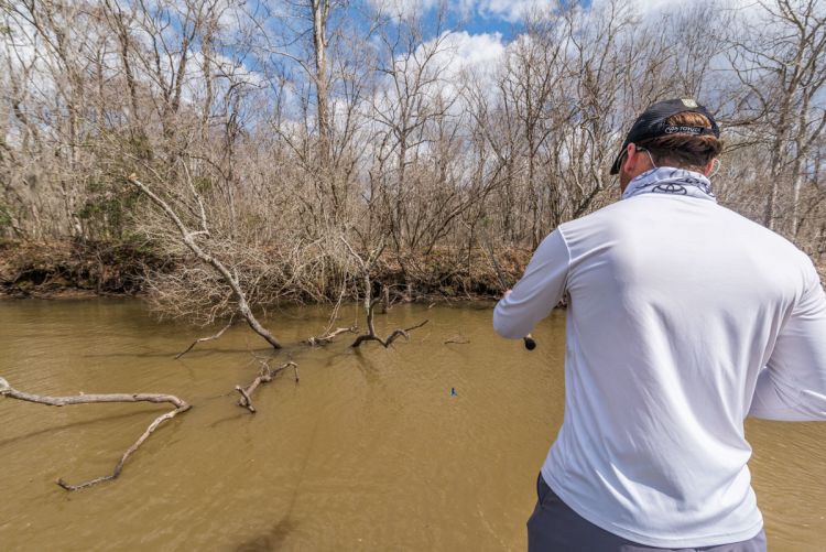 So he carefully fishes a soft-plastic through the branches, working his way into the center of the laydown.