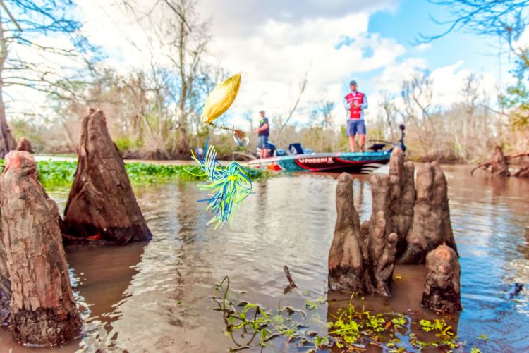 The flash of a spinnerbait can put quick limits in the boat, particularly when bounced off wood.