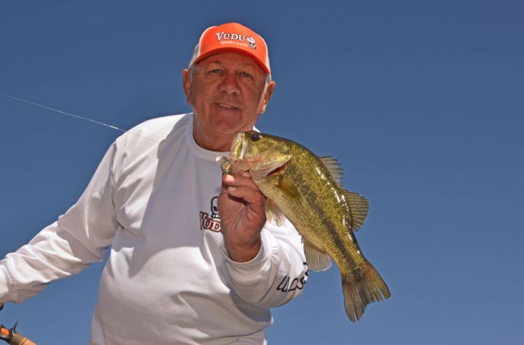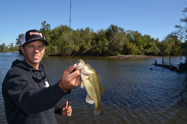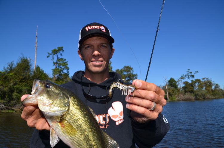 “What Johnny is throwing (a 3 ¼-inch Vudu Shrimp) is the original lure made by Egret Baits. We designed it as a saltwater lure. But when we used it along weed lines in sweetwater marshes for redfish, we did really well with bass.