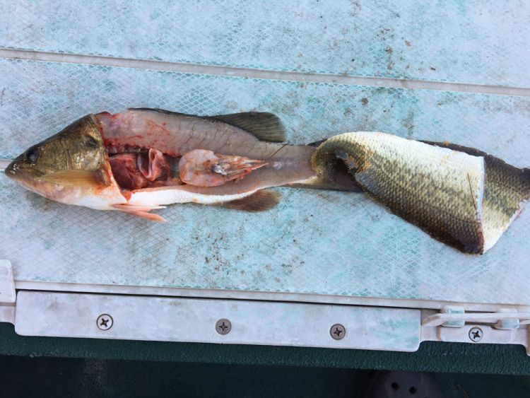 Pogies are heavily used by largemouth bass as food, and are found in the river from May until it gets “really cold” in December, explained Watkins. Shrimp are prevalent mainly in the fall months.
