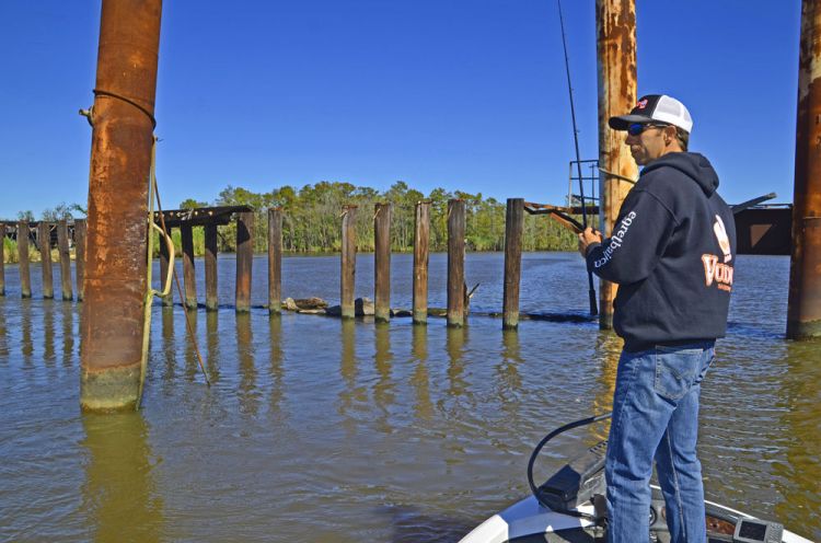 “The good thing about all this industrial structure,” said Watkins, “is that on this river, unlike Calcasieu River, you can catch fish on a rising tide. When the current swirls around any structure, it always creates an eddy that serves as an ambush point for bass.