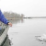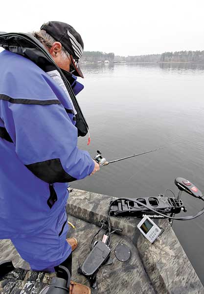 Once he locates the balls of shad, Halbrook pitches out his tail spinner and lets it fall all the way to the bottom. After it lands, all he does is lift and lower, lift and lower. This vertical-jigging action is more productive than a cast and retrieve method because of all the heavy timber that is still at the bottom of Caney Lake.