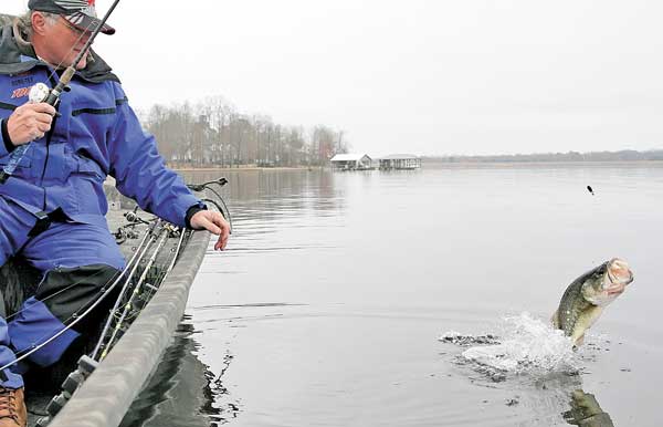 Through much trial and error, Halbrook has now mastered the art of using these fish-shaped chunks of lead to pull up cold-water bass from as deep as 60 feet. Last winter, he landed a lunker that weighed 8.99 pounds, and he tells of a friend who landed one over 12 pounds on a tail spinner.