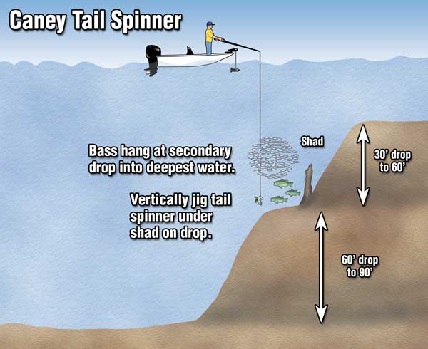 “This movement takes place in stages,” Halbrook said. “It’ll all start some time in October, and by the beginning of November, they’ll be about halfway down to the dam in about 25 to 35 feet of water — however deep the creek is. When the water drops from 65 down to 60, that’s when these bass will go ahead and commit to the deepest holes at the dam. The colder it gets during November, the better you can catch them on tail spinners.”