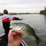 Running a couple miles east, near Patterson City Hall, we started trolling the woods farther off the bank than I expected. In spite of the fact that we were making some pretty long casts, it wasn’t long before I set the hook on a small bass that didn’t quite make the 14-inch minimum required by law to put in the live well. So, like a pro, I released the fish.