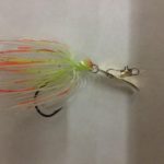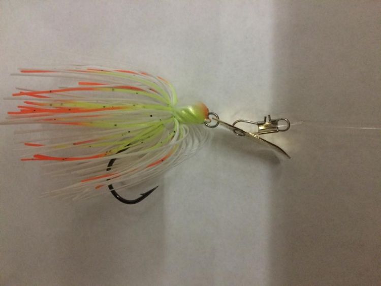 Other color combinations include green pumpkin blade/green pumpkin skirt, gold blade/white shad skirt, gold blade/blue-chartreuse-white skirt, gold blade/chartreuse-white skirt, gold blade/watermelon-blue-orange, gold blade/delta shad skirt, lime blade/delta shad skirt and orange blade/black-blue-orange skirt.