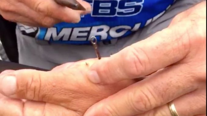 Fellow pro Shaw Grigsby performed the grizzly “surgery” on Christie to remove the hook when the anglers returned to the dock.