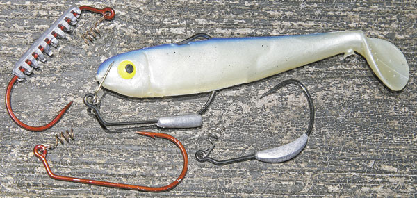 For the weighted needs, some anglers like the all-inclusive simplicity of a swimbait with a built-in lead head like the Spoiler Shad by Crème Lure Co. Those who like to mix and match head size and tail colors will go with something like Revenge Swimbait Hedz or a Yamamoto Swimbait Jig and add the body of their preference.