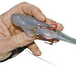 Don’t overdo it, though. Inserting the hook point too far back on the bait creates an unnatural bend by bunching the bait in front of the hook bend. Sebile simplifies the procedure with a hook channel drilled through each bait. When in doubt, use the pinch method: Lay the hook level with your bait, lightly pinch the body where the bottom of the bend aligns and use this point as your guide for running the hook through the bait.