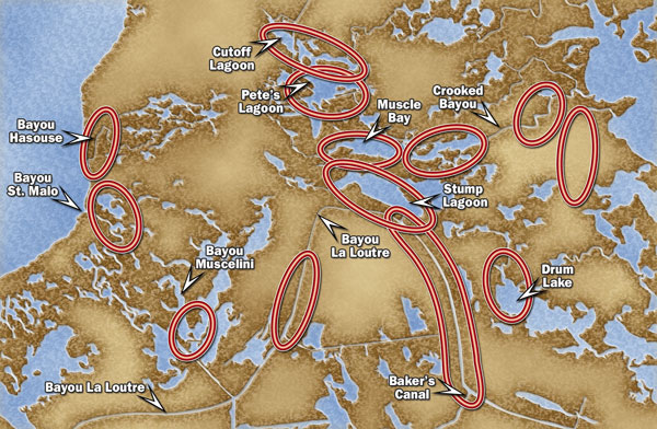 “I like to fish the back side of Bayou LaLoutre, the deep turns in Crooked Bayou and the first part of Bayou Sue. Anywhere that has moving water and deep holes, such as you’ll find in the turns, at the cuts and in the mouths of the bayous, and there’s dozens of places like that all over this marsh.