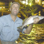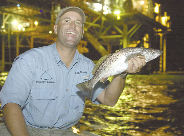 After unhooking one of the larger trout of the trip, LaCoste noticed a rig worker walking the platform overhead. Knowing that this fellow would have the goods on what was going on, he engaged him in some small talk about the fishing.