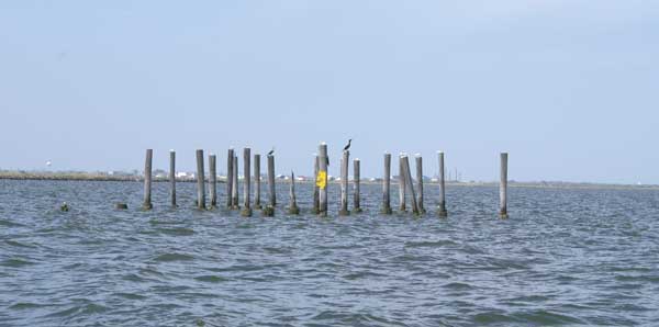 In order to float in the heavy rock-laden barges, a dredge channel is dug and the spoil is deposited in the water near the shoreline. Large pilings and warning signs are in place to alert boaters of the danger posed by the submerged spoil.