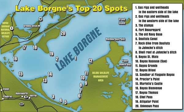 Moving farther to the east/northeast, the captains tick off a litany of prime spots to catch fish in Lake Borgne.