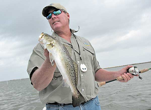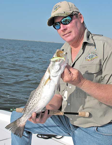 “By the way,” Lambert said. “This will be a great month for topwater action around the reefs and flats, wherever you find some shallow structure, signs of baitfish (especially mullet) and clean water. Every year at this time, we catch trout in the 7- and 8-pound class out here, and this is the month it happens.”
