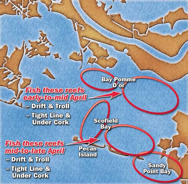 “Generally, the reefs closer inside will pay off in late March and early April, and by mid-April, the reefs farther out will produce better, those around Scofield Bay and Sandy Point Bay, closer to the big water.