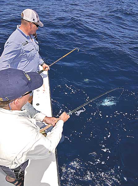 The morning wore on in much the same manner, with Beach luring tuna to the surface with chunks of bonito and small blackfin, and Pierce throwing out his fly only to see it quickly gobbled up in the feeding frenzy.