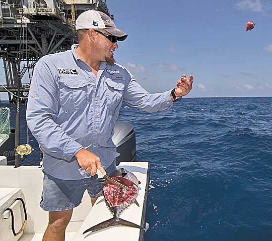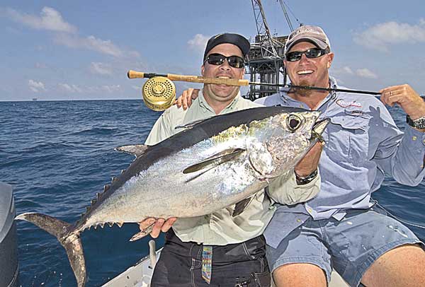 Beach just chuckled, sawed off another chunk of bonito and tossed it into the sapphire-blue waters surrounding the floating rig Mars. The finder was marking pods of fish about 150 feet down, and the red marks were beginning to turn upwards by the time Pierce walked to the gunwale with his rigged-out fly rod.
