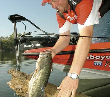 If I can’t turn the fish on to the spinnerbait, I’ll throw a Strike King 4S crankbait in brown/crawfish, lime/chartreuse or blue/chartreuse that will run 2- to 3-feet deep on 20-pound-test line and has a wide wobble in stained water. In stained water, I’ll use a slow to a medium retrieve, and try to deflect the bait off cover.