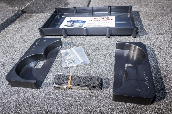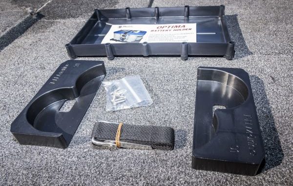 The trays, made by T-H Marine, come with special inserts that fit around the rounded bottoms to securely hold the batteries in place.