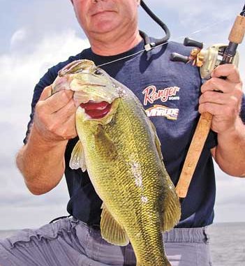 This time of year, we’ll have some of those really hot, slick days, with no wind. I’ll start fishing a hollow-bodied frog on those milfoil mats. In sparse grass, I prefer the Rage Toad.